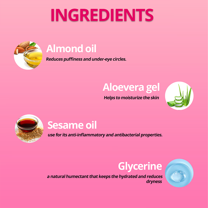 Aqua cream base | almond oil | sesame oil | shea butter | nutmeg oil | clove oil | sodium PCA,glycerine | brahmi extract | jojoba oil | olive oil | EDTA | Veg. Squaline | silicon oil | glycolic acid | papain imidazolidinyl urea | phenoxy ethanol | aloevera gel | coco butter  | Fragrance.