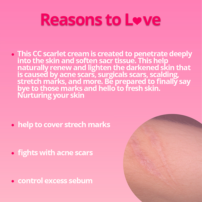 Introducing CC Scarlet Cream – a groundbreaking formula meticulously crafted to delve deep into the skin and tenderly alleviate scar tissue. Say farewell to the remnants of scars and welcome a new chapter of radiant, rejuvenated skin. Designed to address various forms of marks, such as acne scars, surgical scars, scalding, and stretch marks, CC Scarlet Cream is your passport to embracing fresh, flawless skin.
