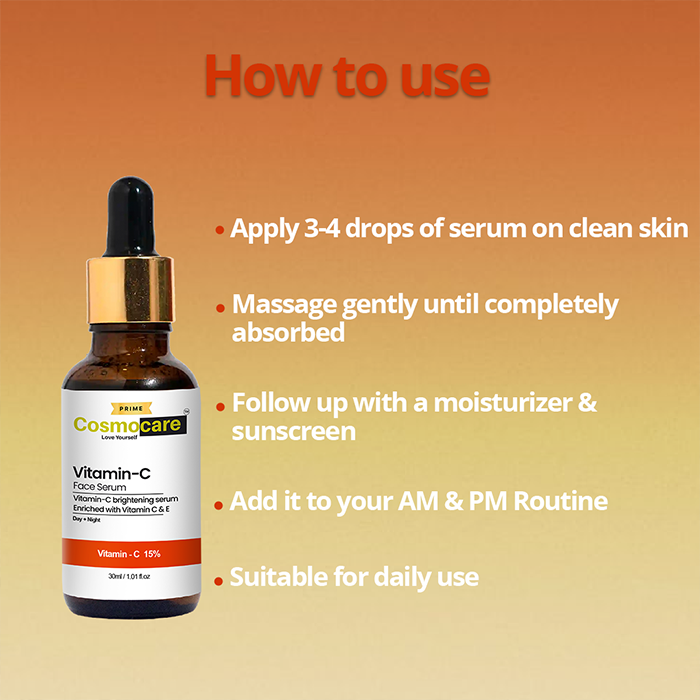 To indulge in the transformative benefits of Cosmocare Face Serum – 5% Vitamin C, apply it to your skin daily. Gently massage the serum into your skin, allowing its rejuvenating power to penetrate deeply and unveil your skin’s natural radiance. With consistent use, you’ll discover a complexion that is illuminated, even-toned, and brimming with youthful vitality.