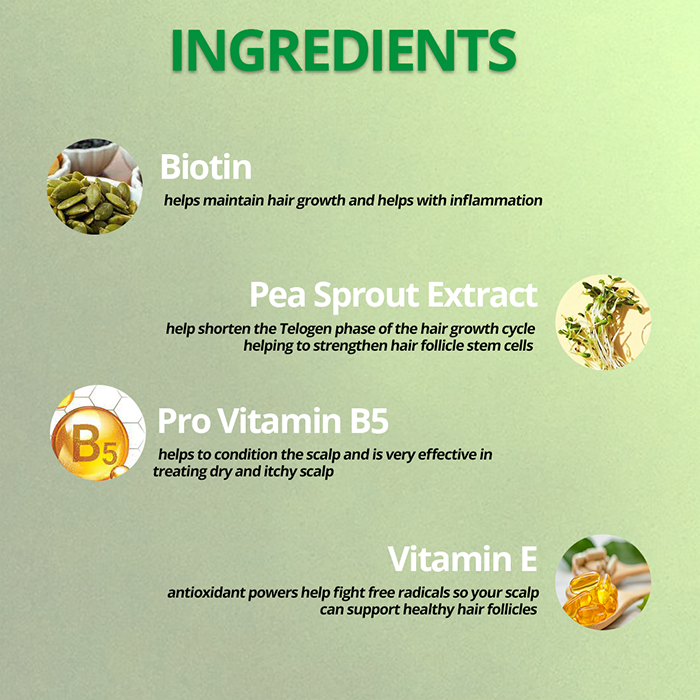 Biotin Extract | Pisum sativum ( Pea ) Sprout Extract ( and ) Phenoxyethanol ( and ) Sodium Benzoate ( and ) Aqua | Ocimum Basilicum Hairy root Culture Extract ( and ) Helianthus Annuus Seed Oil ( and ) Cocos Nucifera Oil | Propane – 1 | 3 – diol | Glycerine | D – Panthenol | Aloe Barbadensis Leaf Juice | Sodium Benzoate | Potassium Sorbate | 2 – phenoxy Ethanol | Fragrance & other permitted ingredients