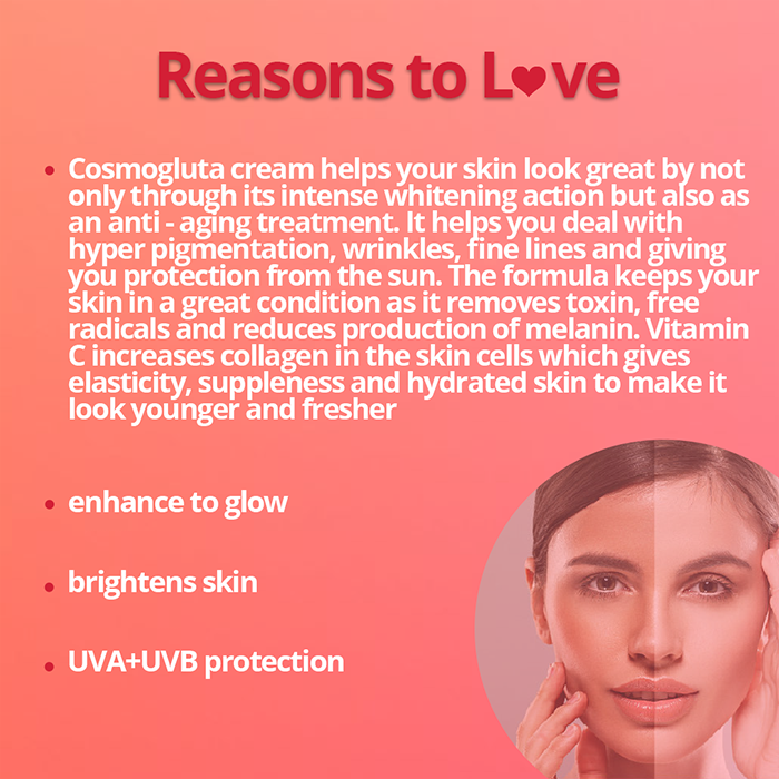 Rediscover the beauty of your skin with Cosmogluta Cream – a remarkable fusion of intense whitening action and anti-aging treatment. This exceptional cream not only enhances your skin’s radiance but also combats hyperpigmentation, wrinkles, and fine lines, providing you with protection and rejuvenation. Experience the transformative power of Cosmogluta as it helps you achieve a flawless complexion that exudes youthful charm. Cosmogluta Cream is your ally in the pursuit of a vibrant, age-defying appearance. It’s not just about skin whitening; it’s a comprehensive solution that tackles the signs of aging while ensuring your skin’s health and protection. Say goodbye to hyperpigmentation, wrinkles, and fine lines as this cream works diligently to rejuvenate and revive.