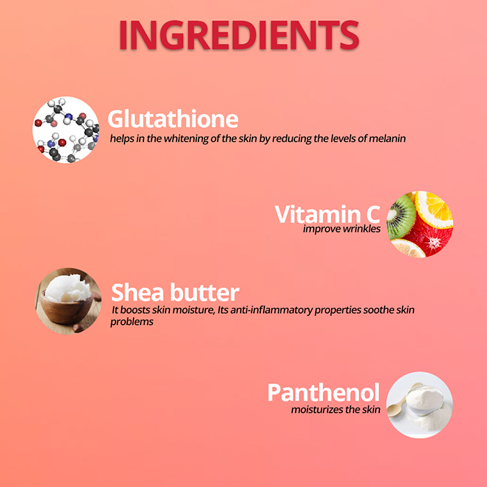 Aqua | Glutathione | Glycerine | Stearic Acid | Emulgade 1000 NL | Cosmedia atc | Alovera Extract | Niacinamide | Pine bark Extract | Vitamin C | A & E | Allantoin Zinc oxide | Hyaluronic acid | Grape seed oil | Imidazolidinyl urea | Sodium Benzoate | 2 Phenoxy ethanol | Fragrance