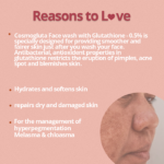 Cosmogluta Face Wash transforms your skincare routine into a revitalizing experience. As you cleanse, the gentle yet effective formula ensures that your skin receives the care it deserves. The combination of ingredients works harmoniously to promote a brighter, more even complexion. With a pH level of 5.5, Cosmogluta Face Wash maintains your skin’s natural balance, leaving it refreshed and supple. Suitable for various skin types, this face wash caters to your individual needs, helping you achieve the skin you’ve always desired. Experience the transformative power of Cosmogluta Face Wash. Infused with Glutathione – 0.5%, it revitalizes, brightens, and nourishes your skin with every wash. Elevate your skincare routine – order your Cosmogluta Face Wash today and embark on a journey to fresher, fairer, and more vibrant skin.