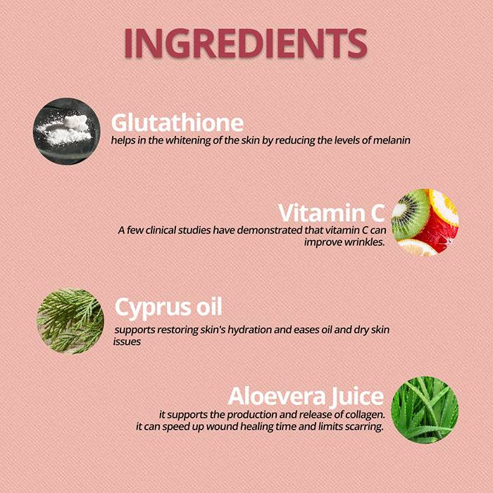 Aqua | Glutathione | Glycerine | Vitamin C | Titanium Dioxide | Orange Oil | Cypress Oil | Citric Acid | Octyl Methoxy Cinnamate | Benzophenone – 3 | Alovera Juice | Fragrance