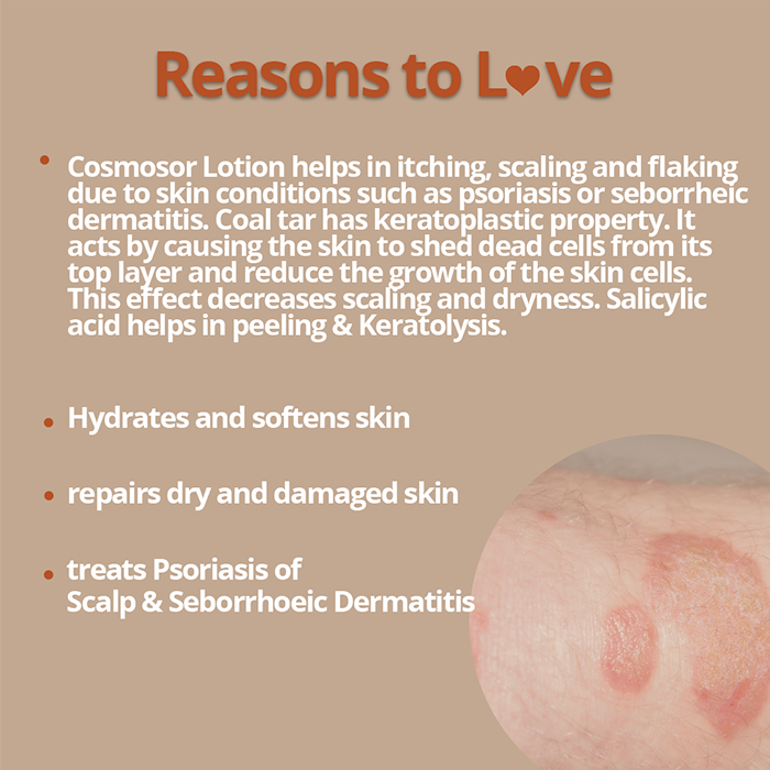 Cosmosor Lotion isn’t just a lotion – it’s your solution for regaining skin confidence. Harness the benefits of coal tar’s keratoplastic property and salicylic acid’s skin-renewing prowess. Reclaim comfort and smoothness as you bid farewell to itching, scaling, and flaking. Experience the harmonious fusion of science and nature, uniquely formulated to nurture your skin. Cosmosor Lotion – because your skin deserves the very best.